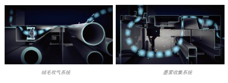在打印介质层面,ML-8000拥有出众的自清洁体系,自带绒毛吹气系统及墨雾收集系统两个清洁体系,可以分别避免面料绒毛及打印墨雾附着到打印头上对打印效果造成影响,同时可以保障打印头的稳定工作延长运行寿命。此外,通过双重防撞头感应器,ML-8000还能以红外线技术来检测面料堆叠、褶皱等容易造成打印头撞头的情况,当感应器检测到如上情况时,将立刻停止字车移动,并发出报警音,确保设备安全稳定。